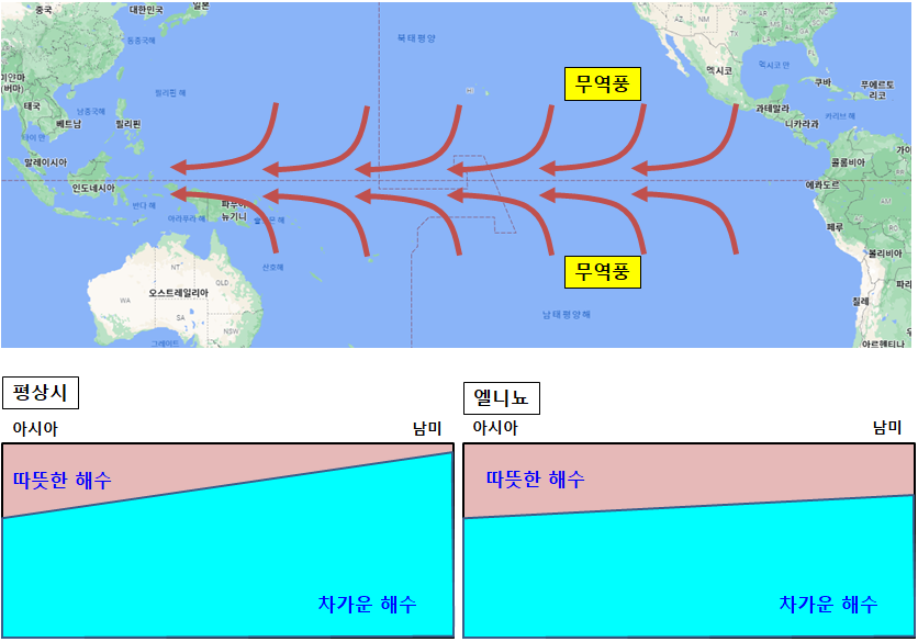 - 평상시 : 지구적도부근에서 항상 무역풍이 불어서 대평양표면의 따뜻한 해수가 동(남미)에서 서(남아시아)로 흐른다