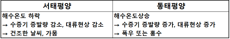 - 엘니뇨 : 무역풍이 약해져서 따뜻한 해수가 동태평양 또는 중태평양에 머무른다