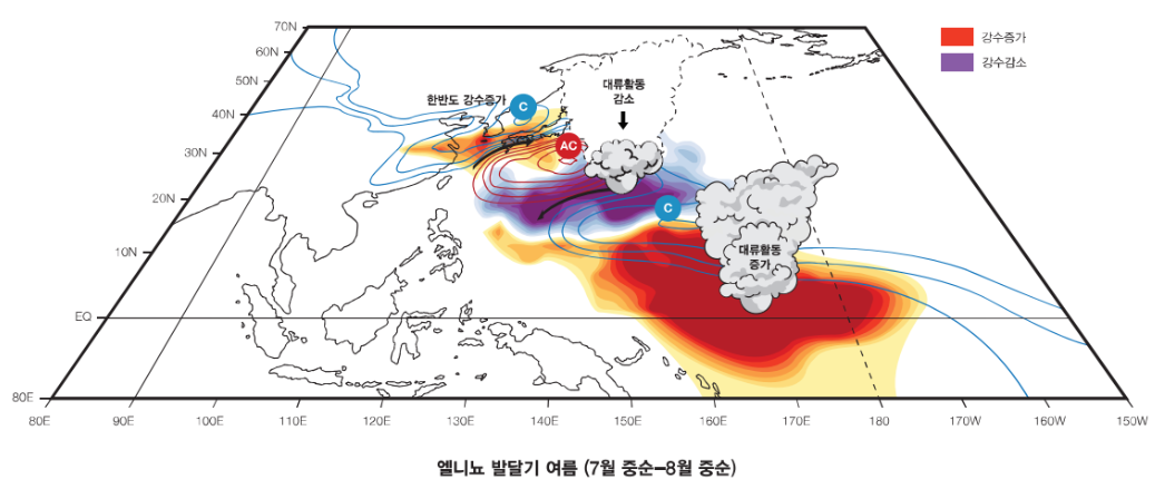 기후변화 전문가, 카이스트 김형준 부교수님 인터뷰에 의하면 엘니뇨는 오히려 우리나라 여름기준으로는 좀 덜 더워지는 요소라고 합니다. 강수는 더 늘어나는 요소이라고 하고요. (출처 : https://n.news.naver.com/mnews/article/052/0001887166?sid=102)